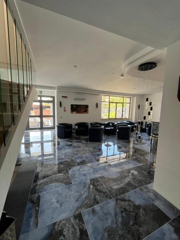 La sala si trova al pian terreno ed è separata dalla reception e della hall dell’hotel tramite porte, dispone inoltre di un’entrata indipendente e di un grazioso spazio esterno con tavoli e sedie.